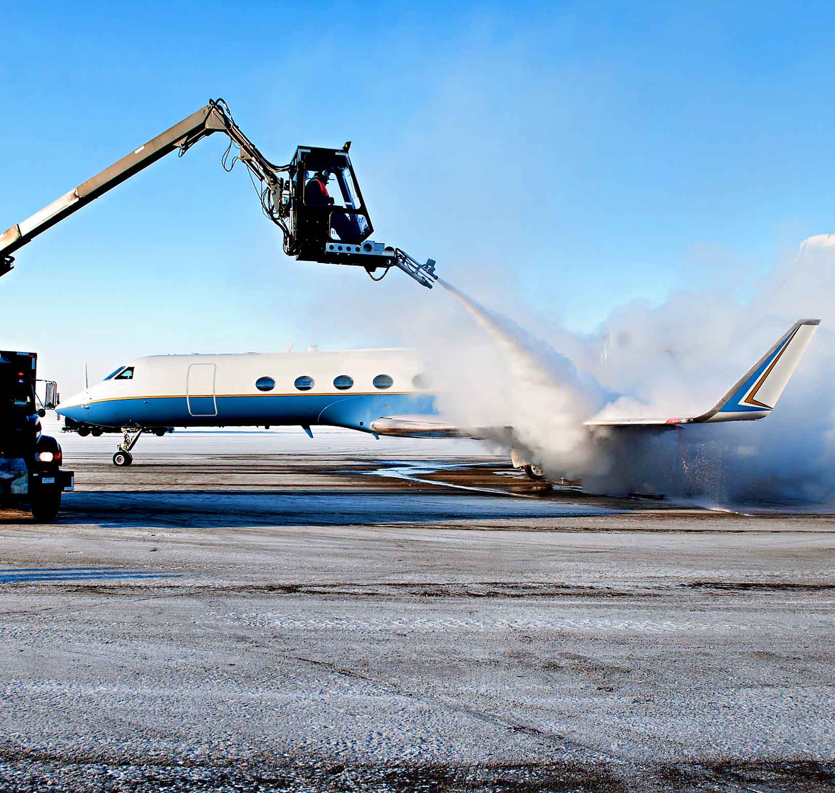 When snow and ice start to collect on the surfaces of the airframe it starts to alter the way air flows past it disrupting the aerodynamics of the aircraft. Lift, along with stability and control are greatly reduces as a result. De-icing rigs are specially designed vehicles that are used to spay the airframe with de-icing chemicals. The chemicals are broken down into two categories, anti-icing fluid and de-icing fluid, both with distinct properties.